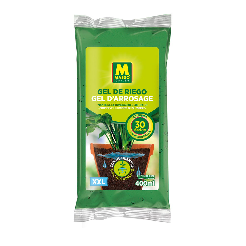 El Gel de Riego Massó Garden mantiene la humedad del sustrato hasta 30 días. Proporciona el agua y el alimento necesarios para la supervivencia de las plantas en macetas y jardineras en periodos sin riego. Se puede utilizar en cualquier época del año. Ideal para periodos vacacionales.